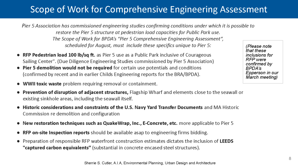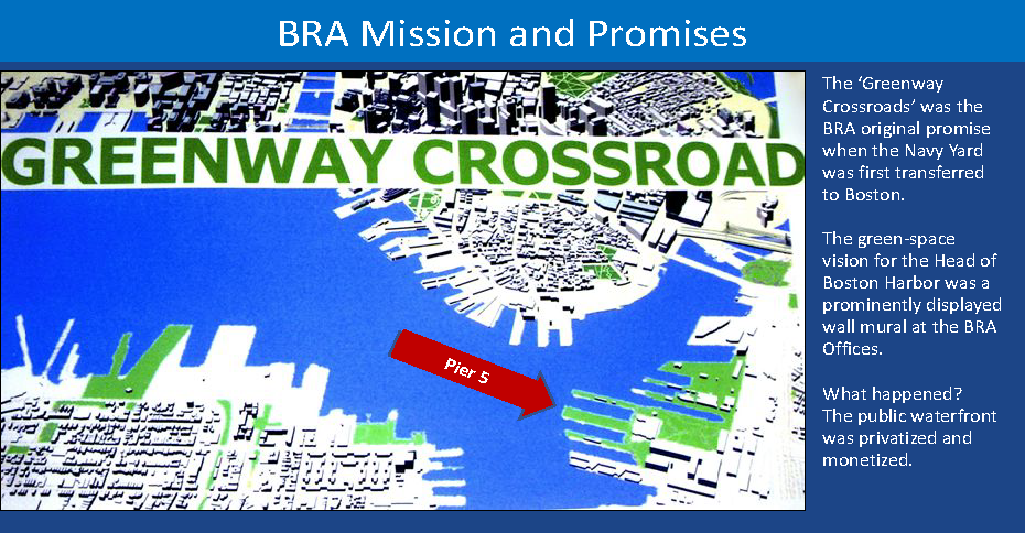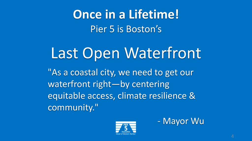 ASM Global Real Estate mega conglomerate, in partnership with Courageous Sailing School and the Boston Redevelopment Authority are actively pursuing commercialization of Pier 5 in a Public Private Partnership with no oversight with BPDA.