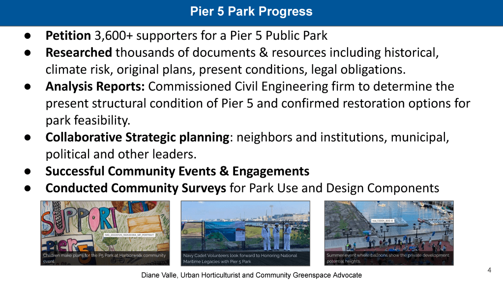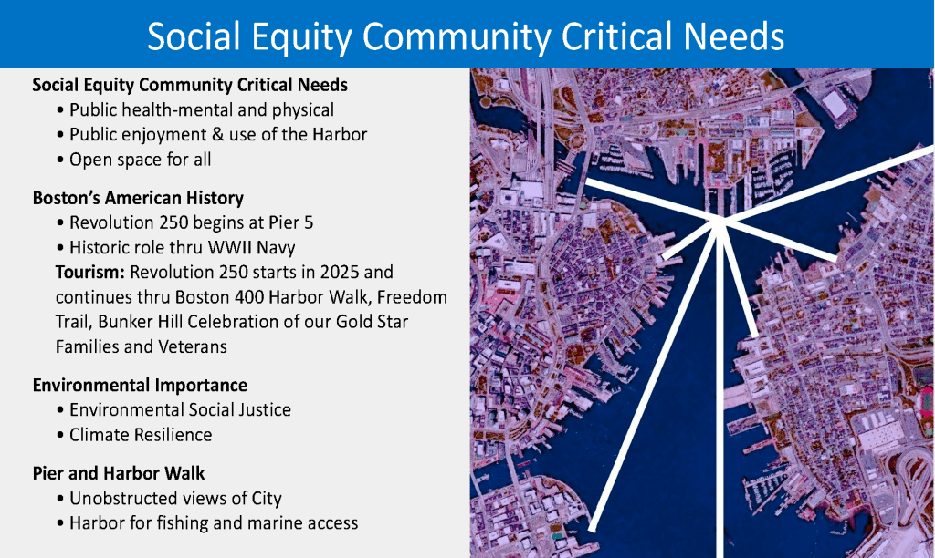 Keep readingThe community of Charlestown is advocating for a public park at Pier 5, emphasizing equitable access to open spaces, health benefits, and historical significance, amid concerns over development and environmental impacts on local health.