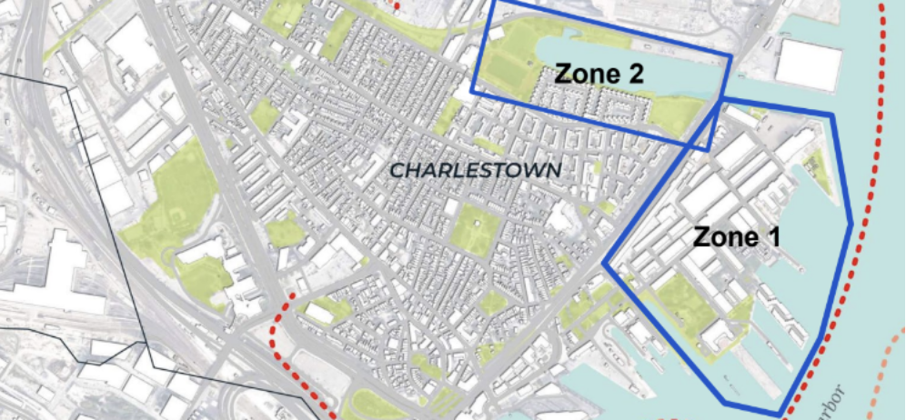 The Charlestown Navy Yard study area will include the harborside and adjacent properties between Pier 3 (a BPDA owned property) to the eastern edge of Barry Field (Zone 1) and the Harborwalk section from Barry Field all around the Little Mystic Channel (Zone 2) (the “Study Area”). These two zones will be the areas of focus for flood mitigation designs during this study, but many areas of the larger Charlestown neighborhood may benefit from the project. See Location Map below.