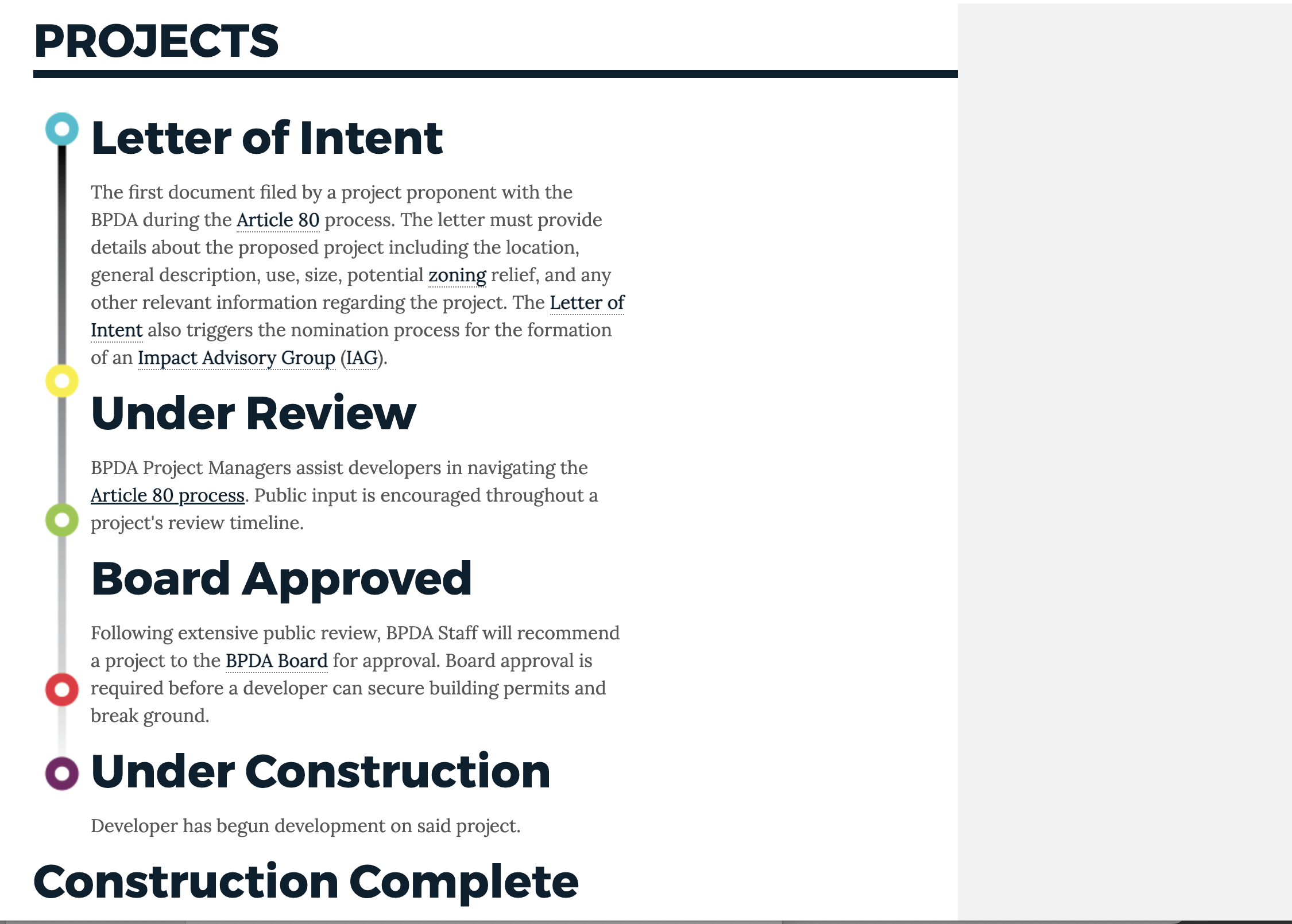 A tool used by the City to dictate the allowed shape, density, and use of development in a given area. Boston’s Zoning Code incorporates a written code (describing setbacks, heights, allowed uses, densities, etc.) and maps that indicate which geographic areas are subject to which zoning guidelines.