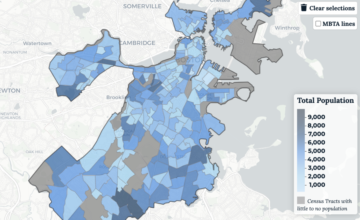 The Boston Neighborhood Change Explorer is a tool for people to visualize some of the ways that Boston and its neighborhoods have changed from 1950 to the present. Users can create custom geographic areas of interest based on census tracts or neighborhoods and move through time using interactive controls in order to explore topics like total population, age distribution, race & ethnicity, nativity, housing occupancy & tenure, educational attainment, and labor force participation.